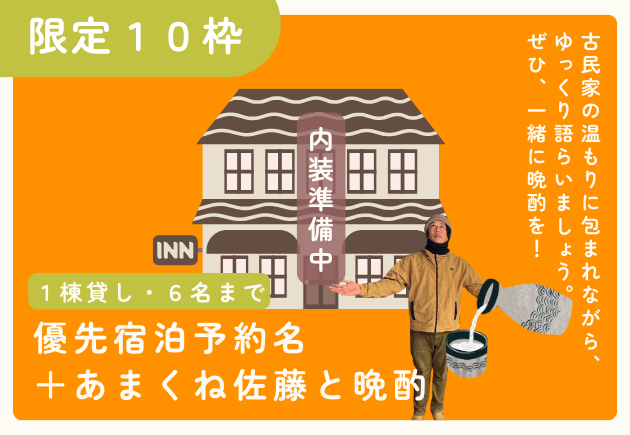 一般予約受付より1週間早くご予約いただけるうえ、オーナーあまくね佐藤と晩酌を楽しめる特別プランです。