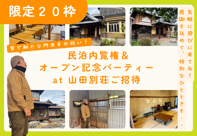 オープン前の再生古民家(別府市)を見学した後、近くの山田別荘で軽食と飲み物付きのパーティーに参加できる権利です。 【リターン上限数】 20枠 【開催日】 2024年4月開催予定(詳細は後日発表) 【ご…