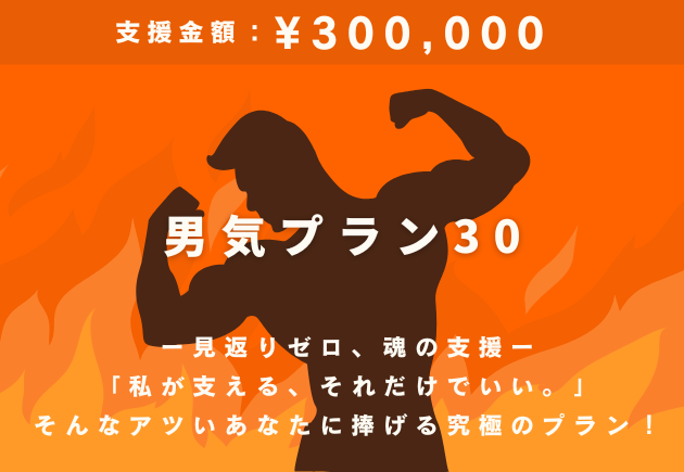 見返りは一切なし。 「それでも、この取り組みに価値を感じ、支援したい!」 そんな”男気”を持った方のためのプランです。 【ご購入に関するご案内】 ・ご希望の場合は領収書の発行が可能です。